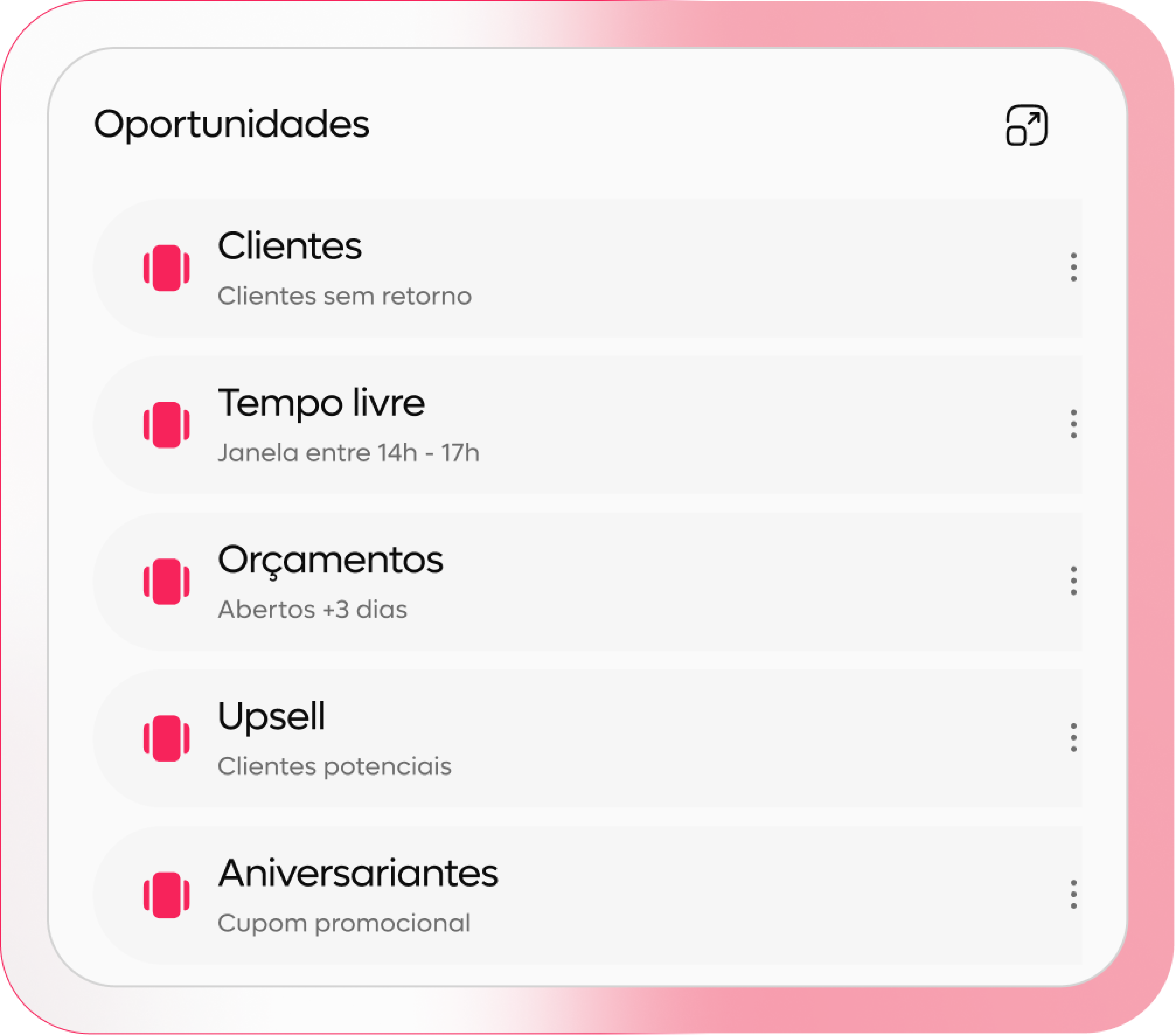 Envie lembretes, confirmações, reagende com um toque e preencha cancelamentos com a lista de espera para manter a agenda cheia e pontual.