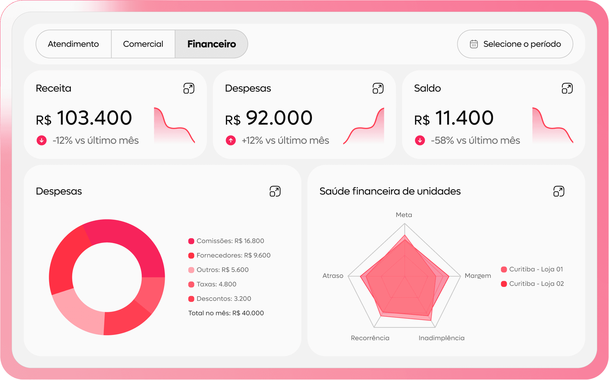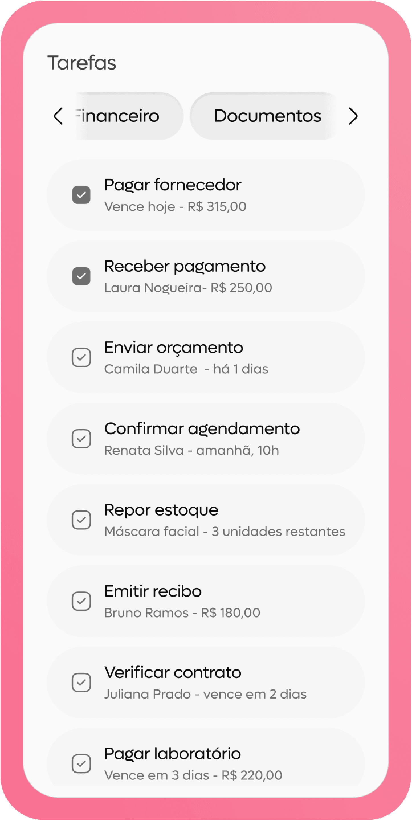 Tudo que sua operação precisa: agenda, financeiro, estoque, documentos e mensagens em um sistema que destaca o que é prioridade e facilita suas decisões.